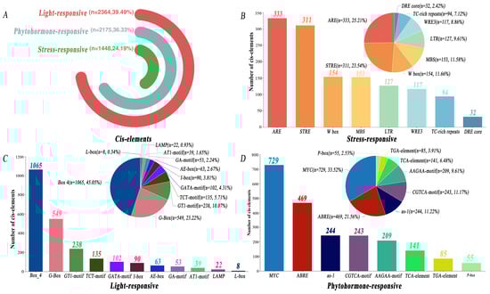 Distribution of the proportions of cis-acting elements across three categories: light response, phytohormone response, and stress response. (A) Proportions of cis-acting elements in each of the three categories. (B) Proportions of stress response elements in the promoter regions of the 205 PfbHLH genes. (C) Proportions of light response elements in the promoter regions of the 205 PfbHLH genes. (D) Proportions of phytohormone response elements in the promoter regions of the 205 PfbHLH genes.