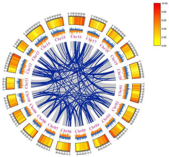 Analysis of PfbHLH gene duplication events. Blue lines within the circle indicate segmental duplication events of PfbHLHs. The blue and yellow colors indicate GC content, and the heatmap represents gene density.