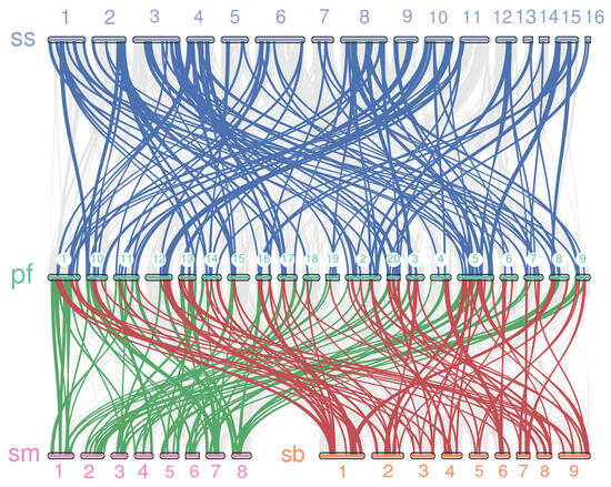 Correlation analysis of Perilla bHLH (Pf) transcription factors with bHLH transcription factors of S. baicalensis (Sb), S. miltiorrhiza (Sm), and S. indicum (Ss). Blue lines represent similar collinearity interval of PfbHLH with S. indicum bHLH; green lines represent similar collinearity interval of PfbHLH with S. miltiorrhiza; red lines represent similar collinearity interval of PfbHLH with S. baicalensis bHLH.