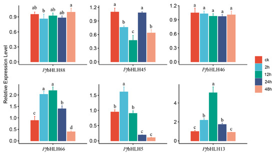 Relative expression of PfbHLH88/45/46/66/5/13 at different time points under MeJA treatment (different lowercase letters indicate a significant difference at the p < 0.05 level).