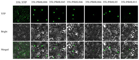 Subcellular localization of proteins can elucidate their potential functions. To determine the subcellular localization of the six candidate PfbHLHs, fusion vectors: 35S::PfbHLH88-PHB-YFP, 35S::PfbHLH66-PHB-YFP, 35S::PfbHLH46-PHB-YFP, 35S::PfbHLH45-PHB-YFP, 35S::PfbHLH13-PHB-YFP, and 35S::PfbHLH5-PHB-YFP, were constructed and transiently expressed in Nicotiana benthamiana (Figure 8). The results demonstrated that six candidate PfbHLHs were localized to the nucleus.