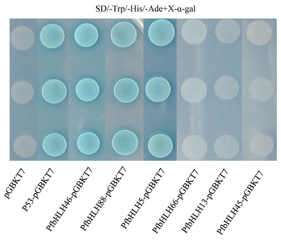 Transcriptional activity is a critical feature of transcription factors. Recombinant plasmids pGBKT7-PfbHLH88, 66, 46, 45, 13, and 5 were constructed and transformed into yeast strain Y2H. Yeast cells containing pGBKT7-PfbHLH88, PfbHLH46, and PfbHLH5 grew normally on X-α-gal medium containing SD/Trp and SD/Trp/-His/-Ade (Figure 9). These results indicate that PfbHLH88, PfbHLH46, and PfbHLH5 exhibit auto-activation activity.