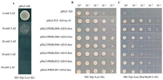 The six PfbHLHs (PfbHLH88; PfbHLH66; PfbHLH46; PfbHLH45; PfbHLH13; PfbHLH5) can bind to the G−box motif; (A) The growth results of co-transforming yeast competent cells with the pHis2 and pGADT7 on SD/−Trp/−Leu/−His medium containing different concentrations of 3−AT (3−amino−1,2,4−triazole). (B) The growth of the empty vector (pHis2 + AD), the positive control (pHis2-P53 + AD−rec−53), and the six candidate genes at a concentration of 0 mM 3−AT. (C) The growth of the empty vector (pHis2 + AD), the positive control (pHis2−P53 + AD−rec−53), and the six candidate genes at a concentration of 30 mM 3−AT.