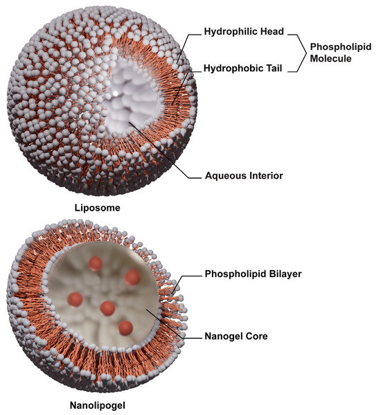 Nucleic acid delivery has gained significant traction in biomedical research, particularly since the development of mRNA-based vaccines against the COVID-19 pandemic. However, premature burst release is a major problem in the delivery of hydrophilic biomolecules, such as antibodies, peptides, siRNA, and mRNA, which may lead to a higher dosage frequency for the desired therapeutic effect [1]. Hence, controlled and sustained release is often preferred to avoid systemic and liver toxicity associated with higher dosages, particularly under chronic conditions [2]. Liposomes are among the most widely researched methods of delivery for hydrophilic molecules owing to their flexibility and versatility in design and fabrication to improve their biological properties, such as biocompatibility and systemic circulation [3]. They can hold both hydrophobic molecules within the bilayer as well as hydrophilic molecules in the aqueous core [4]. However, they still have limited effectiveness in controlling the burst release of hydrophilic cargo as well as immunogenicity issues [5], leading to the development of nanolipogels (NLGs), where there is an additional nanogel core, depicted in Figure 1 below, as a strategy for controlling the burst release of encapsulated cargo [6,7,8]. Previous studies have shown that NLGs have been successfully used to encapsulate and suppress the burst release of hydrophilic drugs and biomolecules, such as doxorubicin hydrochloride [9], dextran-FITC (DFITC) [5,10], maraviroc, and tenofovir disoproxil fumarate [6]. However, these studies used synthetic lipids such as egg phosphatidylcholine (EPC), distearoylphosphatidyl ethanolamine (DSPE), and 1,2-dioleoyl-3-trimethylammonium ropane (DOTAP) [6,9,11] for gel encapsulation, which can potentially lead to immunoreactions.