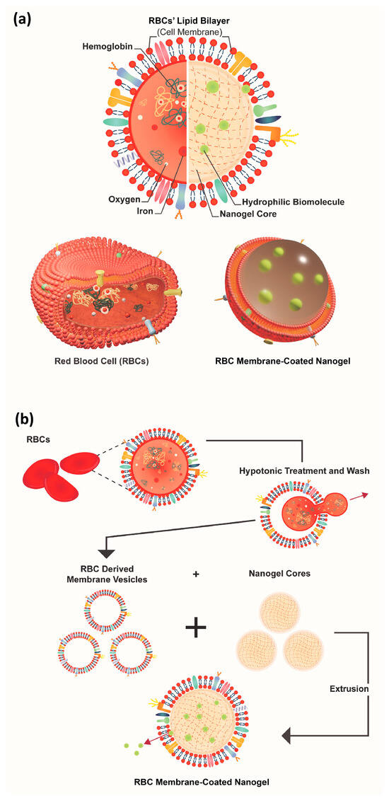 Overall schematic of the (a) comparison between RBC and RBC membrane-coated nanogel (RBC-NG) and (b) the formation of RBC-NG. Harvested RBC membrane vesicles are co-extruded with nanogels to form RBC-NGs, which retain the surface markers and membrane proteins from the RBC membranes.