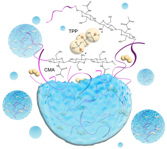 Therefore, in this study, we developed a novel nanoparticle system using chitosan methacrylate (CMA) for ionic gelation with sodium tripolyphosphate (TPP) to allow coating with synthetic lipids and cell membranes. As shown in Figure 3, the polyanion of TPP acts as an ionic crosslinker between the two cationic ends of the neighboring CMA chains, forming CMATPP nanoparticles.