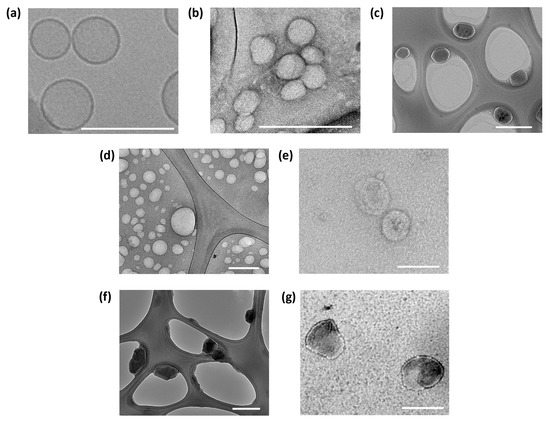 In addition, the zeta potential data, which reflect the charges of the particles, coated EPC CMATPP, RBC CMATPP, and CDN CMATPP NLGs, showed a decrease in the zeta potential from the highly positive CMATPP nanoparticles. This implies that the CMATPP nanoparticles were successfully coated on all the coating vesicles, including EPC liposomes, RBC ghost vesicles, and CDNs, as all had a negative zeta potential. The zeta potential graph, Figure S2 in the Supplementary Materials, also shows a single peak distribution, reflecting the complete coating of all the CMATPP particles. TEM imaging was used to observe the morphologies of the fabricated CMATPP NLGs while cryogenic TEM was used to observe the morphology of bare EPC liposomes, Figure 4a, to prevent the inevitable collapse of the lipid bilayer. Looking at Figure 4b,c, CMATPP nanoparticles and EPC CMATPP NLGs were both slightly smaller than 200 nm and spherical in shape, considering the possible slight deformations from the drying process during preparation for imaging. Similarly, when looking at RBC ghost vesicles in Figure 4d, RBC ghost vesicles of spherical shapes and nanosizes can be obtained from the developed harvest procedure and after coating of CMATPP particles, RBC CMATPP in Figure 4e showed similar morphology and sizes. These observations also hold true for CDN in Figure 4f and CDN CMATPP in Figure 4g. Taken together, these results show that the thin-film hydration and co-extrusion methods can produce homogenously coated CMATPP NLGs consistently, consistent with the DLS size distribution data.