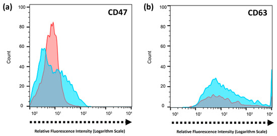 Flow cytometry was performed to check for the presence of coating via the preservation of surface protein markers after co-extrusion. CD47 is a self-marker on the RBC membrane that prevents elimination by macrophages by interacting with signal regulatory protein alpha (SIRPα) on macrophages and prolonging blood circulation [12,58]. The presence of a coating can be deduced by comparing CD47 on the RBC and CMATPP NLGs. Figure 5a shows that CD47 was present on RBC and RBC CMATPP NLGs, indicating the presence of an RBC membrane coating on the CMATPP nanoparticles. This is supported by the zeta potential data in Table 1, which show a change in zeta potential from a positive charge for CMATPP nanoparticles to a negative charge for RBC CMATPP, which can only be achieved by coating with negatively charged RBC ghost membranes. Similarly, CD63, a surface protein of CDN, can be seen in Figure 5b was expressed by both CDNs and CDN CMATPP NLGs. This strongly suggests the successful coating of CDN onto CMATPP. This coincides with the zeta potential data, which shows a drop after coating, similar to the RBC CMATPP NLGs.