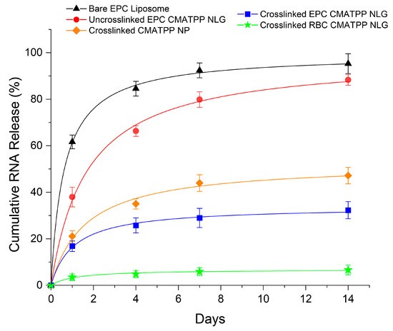 The release of siRNA from CMATPP NLGs was monitored for 14 days under physiological conditions. As shown in Figure 6, uncrosslinked and crosslinked EPC CMATPP NLGs can suppress the initial burst release, with up to a 3-fold and 2-fold difference for crosslinked and uncrosslinked EPC CMA NLGs, respectively, compared to bare EPC liposomes. Although uncrosslinked EPC CMATPP NLGs lack a nanogel core because they are not photocrosslinked, some degree of suppression is still present in the ionic network from the fabrication of the CMATPP core, providing some resistance to the diffusion of the encapsulated siRNA out of the particles [5]. In contrast, crosslinked EPC CMATPP NLGs have a covalently crosslinked nanogel core, effectively hindering the diffusion of encapsulated siRNA to a much greater degree. Under physiological conditions and pH, CMA loses its charge, and ionic crosslinking is compromised. The covalent crosslinks present in the crosslinked CMATPP NLGs remained intact to hold the polymeric network together. This will allow the continuous suppression of burst release and sustained release of encapsulated siRNA in crosslinked CMATPP NLGs. In addition, the release of siRNA was also slowed to a greater extent by 30% for crosslinked EPC CMATPP NLGs and by up to 80% over 14 days for uncrosslinked EPC CMATPP NLG. From these results, it is reasonable to deduce that EPC CMATPP NLGs can effectively suppress the initial burst release of siRNA. Furthermore, the coating of CMATPP nanoparticles could be changed to RBC vesicles, which showed near-complete suppression of siRNA release, as shown in Figure 6. The nanogel core in RBC CMATPP NLGs is expected to have a similar degree of suppression of the initial burst release and sustained release as crosslinked EPC CMATPP NLGs, as their nanogel cores are chemically identical. However, the difference in coating caused further suppression of the initial burst release and sustained release, indicating that RBC membrane coating provides higher drug retention by acting as a diffusional barrier [26]. Furthermore, siRNA has a strong anionic charge, which may result in electrostatic repulsion from the anionic RBC membrane coating [59], similar to the impermeability of cell membranes [60]. In addition, referring to the hydrodynamic size data in Table 1, it is also possible that RBC CMATPP NLGs have a multilayer membrane coating compared to EPC CMATPP NLGs, which will present additional diffusional barriers to the encapsulated siRNA. This could also be expected for CDN CMATPP NLGs, as they are both coated with membranes of cellular origin.