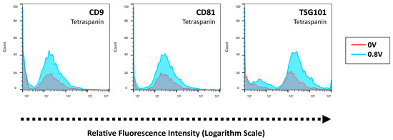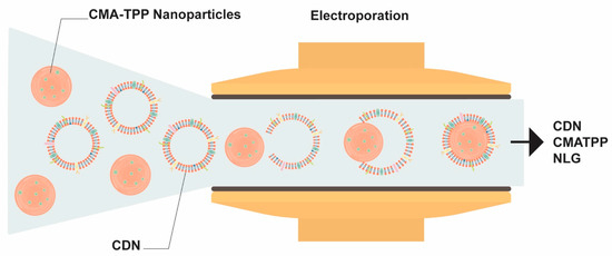 CDNs and CMATPP nanoparticles were passed through the electroporation zone, where pores were formed on the CDNs’ membranes owing to the electric field. This enabled the loading of CMATPP to form CDN-coated CMATPP NLGs without any chemical modification of the membrane or CMATPP nanoparticles. The overall schematic is shown in Figure 7. The hydrodynamic sizes of the samples before and after microfluidic electroporation were measured and are presented in Table 2. Zeta potential analysis of the CDN CMATPP NLGs showed an overall negative charge, signifying the successful coating of negatively charged CDNs onto positively charged CMATPP particles. Particle concentration was also measured using nanoparticle tracking analysis, as presented in Table 2. The minimum CDN required was estimated using the surface area to be coated [61], where approximately three CDNs were required to fully coat two CMATPP particles. CDN was then used in excess to ensure efficient coating of all CMATPP nanoparticles. We also observed that electroporation at 0.8 V caused a decrease in particle concentration of approximately 15%, which suggests that there were interactions between the CMATPP and CDNs, as shown in Figure S3 in the Supplementary Materials. Flow cytometry was conducted to determine the presence of tetraspanins (CD9 and CD81) and multivesicular body (MVB) protein markers (TSG101) [27].