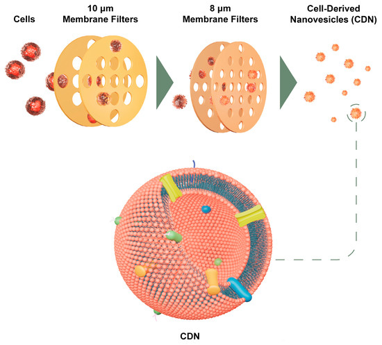 Cell-derived nanovesicles (CDNs) were prepared as follows [27]. U937 cells were cultured to 80% confluence before centrifugation, washed in PBS, and reconstituted to 1 × 107 cells/mL in PBS. The cell suspension was then added to Pierce™ spin cups (Thermo Fisher Scientific, Singapore) with an attached 10 μm pore size, paper filters, and centrifuged at 14,000× g for 10 min at 4 °C. Centrifugation was performed twice through a 10 µm pore filter and twice more through an 8 µm one. The overall schematic is shown below in Figure 9. The filtrate from the final centrifuge was separated by size-exclusion column chromatography using Sephadex G50 (Sigma-Aldrich, St. Louis, MO, USA) soaked in PBS.