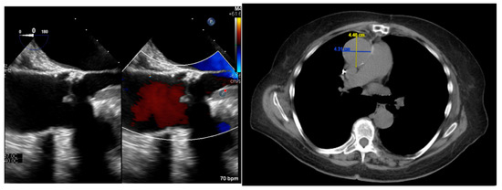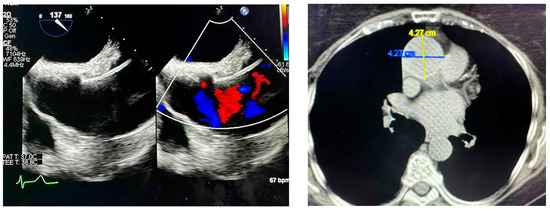 (Left Panel): TEE imaging demonstrating a 4.3 cm ascending aortic aneurysm in subject 2. (Right Panel): CTA measuring an ascending aortic aneurysm of 4.3 cm × 4.3 cm in subject 2.