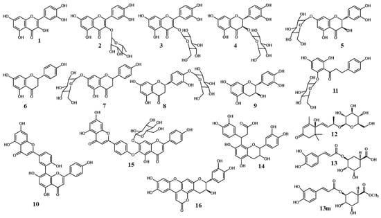 Molecular structures of quercetin (1), quercetin 3-O-α-rhamnopyranoside (2), quercetin 3-O-β-galactopyranoside (3), taxifolin 3-O-β-glucopyranoside (4), taxifolin 7-O-β-glucopyranoside (5), naringenin (6), naringenin 7-O-β-galactopyranoside (7), eriodictyol 4′-O-β-glucopyranoside (8), catechin (9), amentoflavone (10), phloretin 2′-O-β-glucopyranoside (11), roseoside (12), chlorogenic acid (13), and methyl chlorogenate (13m), in addition to the rare natural products catechin-(7,8)-7″-(3,4-dihydroxyphenyl)-dihydro-8″(3H)-pyranone (14), hinokiflavone 7″-O-β-glucopyranoside (15), and Mururin A (16).