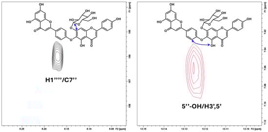 Expanded regions of the 2D 1H-13C HMBC spectrum (left) and the 2D 1H-1H ROESY spectrum (right) of hinokiflavone 7″-O-β-glucopyranoside (15) showing important crosspeaks for determination of linkages between the substructures of the compound. Blue arrows highlight the observed correlations in the molecular structure.