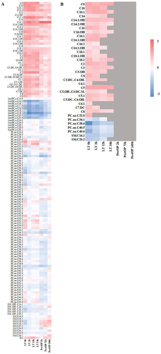 Samples from patients with acute-on-chronic liver failure before and at different time points after liver transplantation were investigated for specific metabolite changes to identify a potential metabolic biomarker set for hepatocellular injury. After removing plate effects, 141 metabolites were considered for further analysis. Log fold changes in metabolite concentrations in LT patients, post-OP control patients and healthy control patients are displayed as a heatmap in Figure 1A. We identified 35 metabolites being significantly altered in patients with hepatocellular injury compared to healthy control patients but not in post-OP control patients compared to healthy controls (Figure 1B). Among these, free carnitine as well as multiple short-, middle- and long-chain acylcarnitines were increased, whereas several phosphatidylcholines and sphingomyelines were found to be decreased.