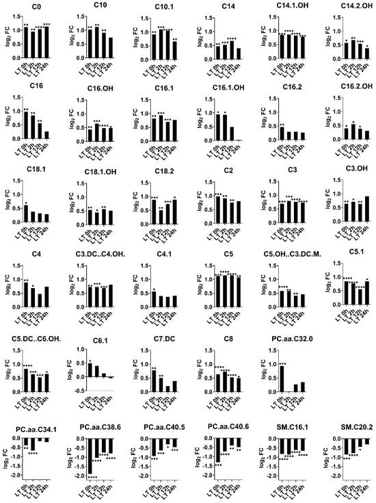 Log2 fold changes of metabolites significantly changed in patients with an acute-on-chronic liver failure before liver transplantation (LT 0 h) as opposed to log2 fold changes of metabolites after liver transplantations (LT 2 h, LT 12 h, LT 24 h). Significant changes are marked (* p < 0.05, ** p < 0.01, *** p < 0.001, **** p < 0.0001).