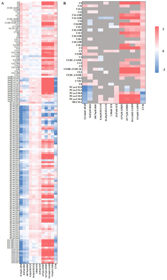 ROC demonstrated a concentration-dependent hepatotoxic potential in in vitro HepG2/3A cell models with decreased cell counts and impaired functionality in response to the exposure [98]. In the metabolic analysis in our study, ROC also demonstrated significant changes in some of the metabolites of the biomarker set, both acylcarnitines and phosphatidylcholines. However, a dose dependence could not be clearly observed here. The exact mechanism of ROC causing hepatotoxicity is still unclear but may be related to oxidative stress and mitochondrial impairment.