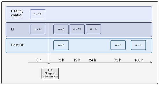 Flowchart of patient cohort. The patient cohort includes samples of patients with liver insufficiency before and at several time points (2 h, 12 h, 24 h) after liver transplantation (LT), samples of patients with different surgical interventions at different time points (2 h, 72 h, 168 h) after the intervention (post OP) and samples of healthy controls.