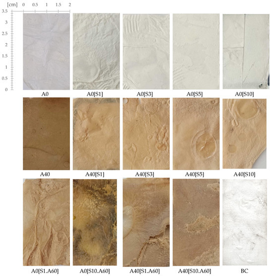 Images of materials. Samples codes: BC—bacterial cellulose (biopolymer after fermentation process, pre-treatment); A0—bacterial cellulose modified with glycerol; A0[S1], A0[S3], A0[S5], and A0[S10]—bacterial cellulose modified with glycerol followed by HSt at a concentration indicated by the bracketed numbers; A40—bacterial cellulose modified with a mixture of glycerol and AP at a concentration indicated by the number; A40[S1], A40[S3], A40[S5], and A40[S10]—bacterial cellulose modified with a mixture of glycerol and AP followed by modification with HSt at a concentration indicated by the bracketed numbers; A0[S1.A60] and A0[S10.A60]—bacterial cellulose modified with glycerol followed by modification with a blend of HSt at a concentration of 1% and 10%, respectively (indicated by the respective numbers), and AP at a concentration of 60%; A40[S1.A60] and A40[S10.A60]—bacterial cellulose modified with a mixture of glycerol and AP followed by modification with a mixture of HSt at a concentration of 1% and 10%, respectively (indicated by the respective numbers), and AP at a concentration of 60%.