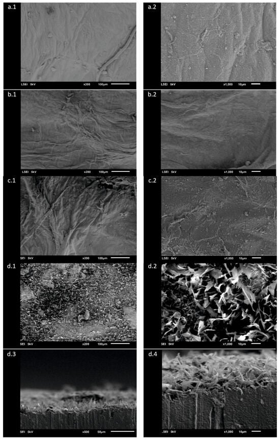 SEM images of materials. Images: (a.1,a.2)—bacterial cellulose (BC); (b.1,b.2)—bacterial cellulose modified with glycerol (A0); (c.1,c.2)— pre-treated BC modified with glycerol, then with apple powder at a concentration of 40%; (A40); (d.1–d.4)—bacterial cellulose modified with glycerol followed by modification with a mixture of HSt at a concentration of 10% and AP at a concentration of 60% (A0[S10A60]). Images (a.1–d.2) show views of the surface, whereas (d.3,d.4) show the cross-section.