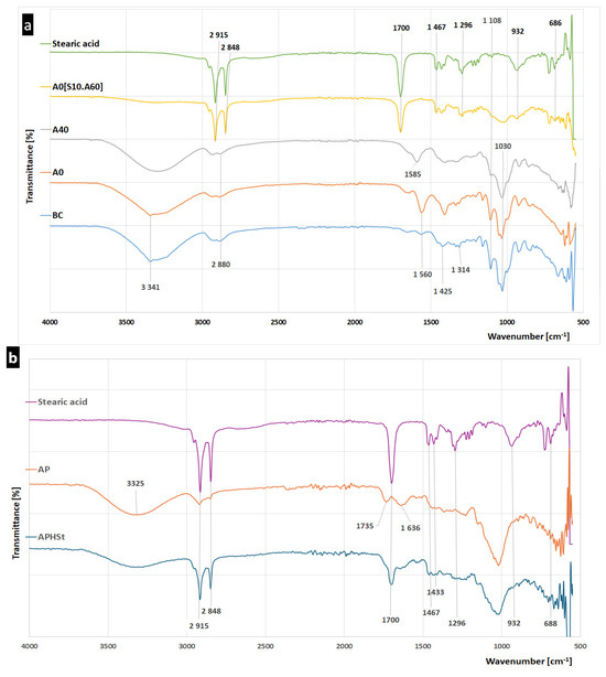 In the spectrum associated with APHSt (stearic acid and AP) and A0[S10.A60] (the material to which the coating layer was applied) a similar pattern was also observed. Comparing the spectrum of stearic acid with the spectra of the cover and materials changes such as signal weakening can be observed. The intensity of molecular vibration was markedly reduced in two regions. The first change concerns the broad band in the region from 3560 cm−1 to 3145 cm−1 assigned to O-H bond stretching (APHSt and A0[S10.A60]). The further affected bands were at 932 cm−1 and 1296 cm−1 (Figure 3b), suggesting interactions with AP influencing -OH bending vibrations. In the spectrum of A0[S10.A60], the introduction of the coating resulted in a weakened signal in the region from 1080 cm−1 to 980 cm−1, with the absorption peak at 1030 cm−1, which is attribute to the bending of C–O–H bonds of carbohydrates [37,38,39] or C–O–C pyranose ring skeletal vibration [37,40,41].