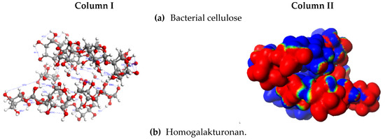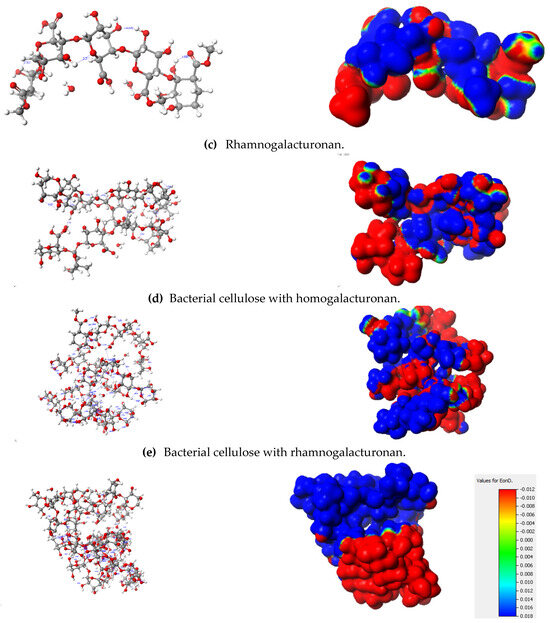 The reduction in energy observed in cellulose–polysaccharide composite systems with HG and RG polymers is indicative of their thermodynamic stabilization following the formation of the mixed biopolymer system. This outcome is observed to arise as a consequence of the operation of two distinct synergistic mechanisms. The first mechanism is associated with the mutual polarity of cellulose and the pectin fraction to which it is being applied. This can be described as the interaction of dipole systems, with mutual orientation observed (Figure 4d,e). The contribution of dispersive forces [51] and electrostatic interactions, in addition to hydrogen bonding between OH…O groups [52,53,54], to the maintenance of the internal cohesion of cellulose microfibrils and the sorption of non-cellulosic substances was highlighted as being of significant importance [55].