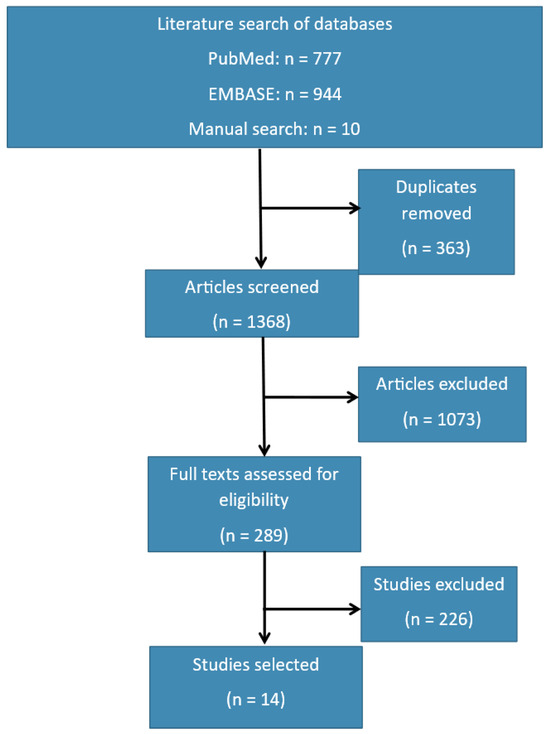 The initial literature search yielded 777 studies from PUBMED, 944 studies from EMBASE, and 10 studies from manual searches, which included reviewing the reference lists and/or bibliographies of the selected studies. Duplicates were removed, and articles were screened by reviewing their dates, titles, abstracts, and full texts. In total, 14 eligible studies were identified from the 289 articles published from 2000 to 2023 in the English language or with English translations. An overview of the included studies and their respective findings is presented in Table 1.