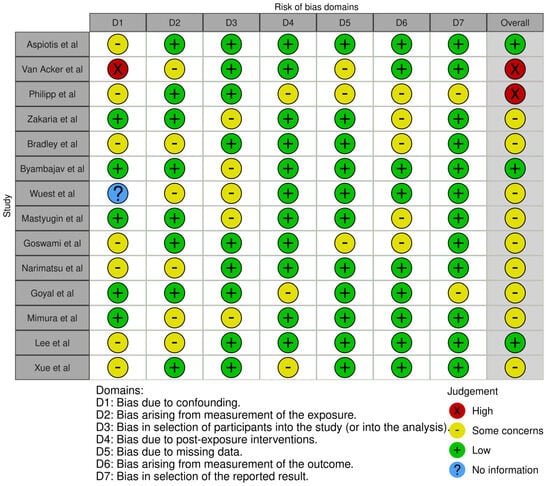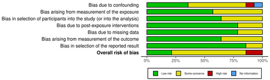 Risk-of-bias assessment was performed using the Risk Of Bias in Nonrandomized Studies of Exposure (ROBINS-E) [43], and the overall results are presented in Figure 4 and Figure 5.