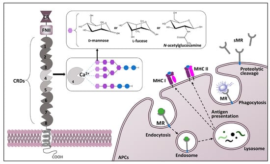 The involvement of MR in innate immune responses was recognized early. The innate immune system presents a first-line defense against pathogens, mainly through pattern recognition receptors (PPRs) present on macrophages and dendritic cells (DC) [54]. When attached to a ligand present on the surface of an invading microorganism, the PRRs can facilitate their uptake through phagocytosis and/or initiate intracellular signals, ultimately triggering an activation of the host cell [29,54]. The MR acts as PRR via its CTLDs binding mannose and N-acetylglucosamine, which are often found as terminal residues on surface glycoproteins of many microorganisms [28,55]. It was shown that MR recognizes and binds a variety of bacteria [56,57,58], viruses [59,60], fungi [61,62], and parasites, determining them for endocytosis by macrophages and subsequent degradation in lysosomes [28].