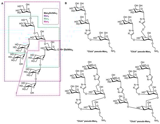 (A) Structure of the Man9GlcNAc2 oligosaccharide with the Man4, Man5, and Man8 substructures highlighted with appropriate colors. (B) Structures of the “click” pseudo-high-mannose mimics.