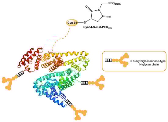 Human serum albumin (HSA), a non-glycosylated protein, is also an attractive carrier for drug delivery systems [93]. Chemically modified Man-albumins are largely taken up by the liver via an MR-mediated mechanism. Hirata et al. designed and genetically engineered a recombinant oligomannosylated-HSA mutant that can be selectively delivered to the liver via MR on the liver non-parenchymal cells (and, thus, work as a carrier for liver-selective therapeutics) [94]. Recently, a dual-modified albumin in which one molecule of polyethylene glycol (PEG) was conjugated to the Cys34 residue in Man-HSA (Figure 4) was developed. This trivalent system preferably enables the dual-targeting to cancer-associated fibroblast and tumor-associated macrophage-specific MRs (CD206 and CD280), which resulted in a seven times stronger suppression of melanoma growth in B16F10 tumor-bearing mice, when the effect is compared to PEGylated albumin [95]. Furthermore, the PEG-Man-HSA conjugate mediated the disruption of the tumor microenvironment by polarizing tumor macrophages toward the M1 profile.