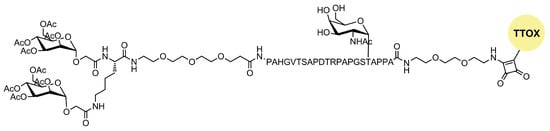 A novel tumor-associated mucin MUC1 glycopeptide anticancer vaccine functionalized with covalently linked divalent mannose ligands induced much stronger specific IgG immune responses in mice than the non-mannosylated reference vaccine. Additionally, mannose-binding led to increased numbers of macrophages, dendritic cells, and multiple T cell activation in the local lymph organs. Mannose subunits were introduced using N-terminal mannosyl glycolic acid coupled to both amino groups of a terminal lysine (Figure 5). The tetra-mannosylated conjugate was better recognized by MR and potentially presents a promising target for anti-cancer immunotherapy [15].