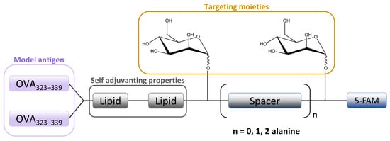 The in vitro MR-mediated uptake in the APC studies of Sedaghat et al. confirmed the importance of the presence of both mannosyl and lipidic moieties in lipopeptide vaccines for stronger MR binding compared to non-mannosylated compounds [24]. It is well known that the lipidation of peptides is an effective method for improving the metabolic stability and the immune-stimulatory properties of peptide-based vaccines [115,116]. When combined with mannosylation, a specific targeting ability can be achieved. A library of fluorescently labeled mannosylated lipopeptides, with the ovalbumin epitope incorporated (Figure 6), was synthesized using fluorenylmethyloxycarbonyl (Fmoc) solid phase synthesis (SPPS). This research is an extension of previous studies in which it was shown that the distance between the mannose groups plays an important role in the uptake of mannosylated compounds through the MR on monocytes [117,118]. More specifically, shorter spacers between the mannose units were shown to be more effective [9,118]. Recently, Zhang et al. designed mannose-modified liposomes, with antagonistic peptides as co-delivery systems grafted onto a liposome surface, that successfully activated macrophages and stimulated the secretion of various cytokines. The additional hyaluronic acid functionalization of liposomes improved the systemic circulation stability of complexes in vivo and promoted its accumulation in tumor sites [119].