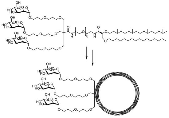 The comparative binding and uptake of liposomes decorated with various mannose oligosaccharides by cells expressing the MR or DC-SIGN was recently described by Gao and co-workers [128]. A series of glycolipids comprising either mannose, a tri-antenna molecule of α-D-mannopyranoside, the [Manα1-3(Manα1-6)Man], the pseudo-Man4 or pseudo-Man5 were synthesized and embedded in fluorescein-labeled liposomes. A tri-antenna α-D-mannopyranoside X showed the best potential for targeting liposomes to MR (Figure 7).