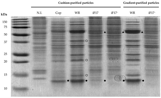 2.3. Viral iF17− Particles Had Similar SDS-PAGE Protein Profile as That of the iF17 Virions (Except for 11K/F17)