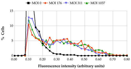 Measurement of mCherry fluorescence in BSC40 cells infected with MVA-T7g and co-infected with iF17− particles. BSC40 cells were infected for 20 h with MVA-T7g at an MOI of 176 particles per cell (1.7 PFU) and were co-infected with iF17− particles at an MOI of 176, 311 or 1037 particles/cell. Cells were imaged using identical exposure settings (with Zeiss microscope using an mCherry fluorescence filter). Fluorescence intensities of cells were computed with the CellProfiler software (version 4.0.7), as described in Section 4. The curves were derived from histograms of number of cells present in 0.025 intervals. Ordinate values outside the scale—50% for x = 0.10 and 21% for x = 0.125—are not shown on the graph.