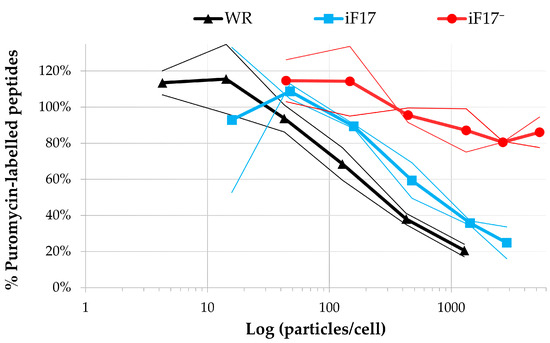 Rates of protein synthesis in cells infected with WR, IF17 and iF17− particles. BSC40 cells grown in 2 cm2 wells were infected with WR, iF17 virions or iF17− particles (numbers indicated on the X-axis) and incubated for 2.5 h at 37 °C. Cycloheximide (118 µg/mL) was added for 30 min to freeze polysomes, followed by the addition of puromycin for 20 min. The cells were washed with PBS and total cell extracts were prepared as described in Section 4 and the peptidyl-puromycin present in each well was quantified by Western blot, using an anti-puromycin antibody. The ratio of puromycin-labelled peptides produced in wells was calculated relative to that of the uninfected cells (Y-axis). Thin lines correspond to values of duplicates. Particles/PFU ratios were 153 for WR, 84 for iF17 and 5652 for iF17.