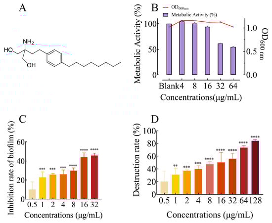 Recently, these have been numerous reports in the literature on the use of compounds from various sources for antibiofilm purposes. Antimicrobial peptides such as protegrin 1, pleurocidin, ll-37, and human β defensin 3 [], along with nanoparticles such as ZIF-67 nanoparticles consisting of imidazolate anions and cobalt cations [] and nanostructured copper films [], have been investigated for their potential antibiofilm properties. Additionally, natural products and their derivatives, including carvacrol, cinnamaldehyde, thymol [], and fingolimod (FLD) [], have shown promising antibiofilm activity. FLD is an FDA-approved oral drug for multiple sclerosis that regulates sphingosine-1-phosphate (S1P) receptors to reduce lymphocyte circulation [,]. In a recent study, it was discovered that FLD exhibited substantial antibacterial activity against Gram-positive bacteria, including Staphylococcus aureus (S. aureus) and Acinetobacter baumannii (A. baumannii), and demonstrated specific antibiofilm effects on Gram-positive bacteria. Previous studies have demonstrated the synergistic antimicrobial effects of FLD; however, its activity against K. pneumoniae biofilm has not yet been reported []. Alternatively, screening active molecules from approved drugs offers two obvious advantages: established safety and time-saving efficiency.