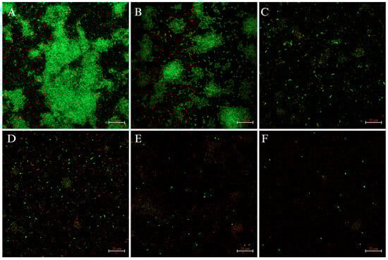 CLSM images of viable bacteria in K. pneumoniae biofilms ((A) without FLD, (B) treated by 4 µg/mL FLD, (C) treated by 8 µg/mL FLD, (D) treated by 16 µg/mL FLD, (E) treated by 32 µg/mL FLD, and (F) treated by 64 µg/mL FLD).