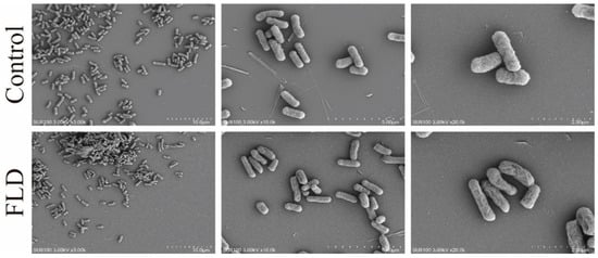 The inhibition of biofilm formation by FLD and its relationship to bacterial morphology was investigated. SEM results showed that the control group exhibited a predominantly uniform distribution of elliptical or rod-shaped cells, with little cell accumulation. However, after FLD treatment, significant changes were observed in comparison to the control group. Specifically, the application of FLD at a concentration of 32 μg/mL had a significant impact on cell morphology. In the 10 µm image, it is evident that after FLD treatment, cells tended to aggregate and form loosely arranged and stacked micro-clusters, creating a three-dimensional mesh-work. Additionally, some cell membrane structures appear to be disrupted, leading to cell death. Similarly, in the 5 µm and 2 µm images, the cell membrane exhibits significant shrinkage and an increase in cell aggregation (Figure 3).