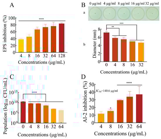 As the most important structure of biofilms, EPS can protect cells and enhance bacterial tolerance and innate immune response []. To access the production of EPS in biofilms after treatment with FLD, the ruthenium red staining method was used. The results demonstrated that FLD treatment effectively inhibited EPS production in a dose-dependent manner (Figure 4A). Even at a low concentration of 4 µg/mL, FLD was found to significantly inhibit EPS production, with an inhibition rate exceeding 20%. The results obtained are consistent with the inhibitory effect of FLD on biofilm formation. The results showed that FLD reduced the EPS production of K. pneumonia.