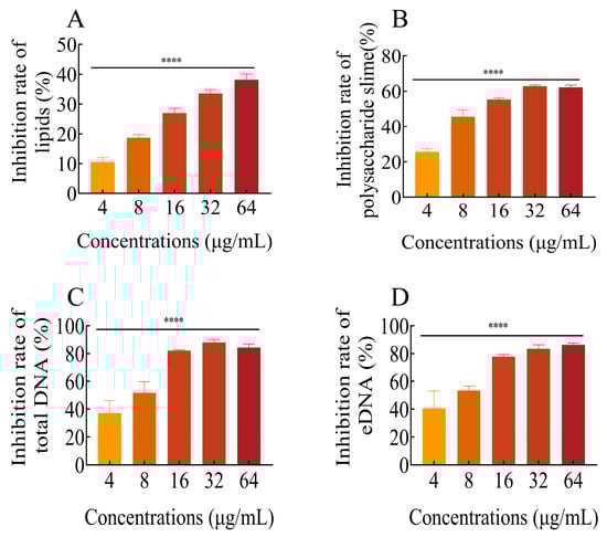 The contents of lipids (A), polysaccharide slime (B), total DNA (C), and eDNA (D) in the biofilm matrix upon FLD treatment. Each bar represents the mean ± SD of three independent experiments, **** indicates p < 0.0001 when compared with control group.