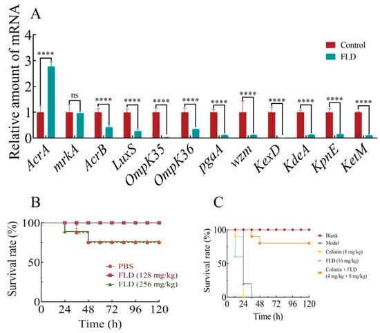 (A) The impact of FLD (32 µg/mL) on the transcription of biofilm-regulated genes. The qRT-PCR analysis demonstrated a noteworthy disparity in eleven genes in comparison to the control. ns indicates not significant **** indicates p < 0.001 when compared with control group. (B) The survival rate of G. mellonella in the three groups with different treatments for 120 h. (C) The survival rate of G. mellonella. The control group exhibited no mortality within 4 days. Conversely, the model, colistin, and FLD groups all succumbed to death within 36 h following bacterial infection. Notably, the survival rate of subjects receiving a combination treatment of FLD and colistin reached 80%.