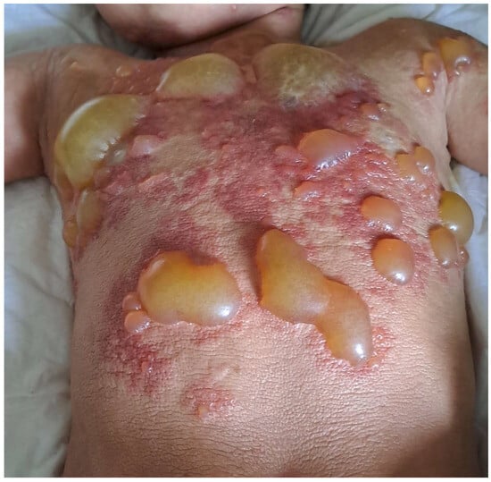 DCM manifests as generalized erythema, usually with pachydermia (thickened skin), associated with pronounced dermographism or a positive Darier’s sign, which are evident after minimal mechanical irritation of the skin [6]. Extensive blistering is a typical feature of DCM in the infantile period [6,19,40,58,59] (Figure 1). It is worth pointing out here that the diagnosis of DCM should be established only in children with generalized thickened and darker than normal skin, but not in those with extensive, confluent MPCM or bullous lesions [6]. The current classification of CM does not distinguish bullous mastocytosis as a separate form of the disease because blistering may also occur in MPCM and mastocytoma [6]. In infants, DCM may present with large hemorrhagic blisters and with small vesicular lesions; however, both variants may coexist [8,19,59]. The hemorrhagic nature of bullous lesions, as well as prolonged bleeding from skin wounds in some children, may be related to the local release of heparin from dermal MCs [6]. Papules can be present in pachydermatous skin areas. Occasionally, DCM may present as generalized erythema with pseudoxanthomatous or tumor-like lesions [6,11,59,60]. Clinical manifestations of DCM tend to evolve with age [6,8]. Extensive blistering is predominantly observed in infancy and usually ceases within 2 or 3 years of age (Figure 1), while diffuse pachyderma with slight brown or yellow discoloration and a leather-like skin appearance develop with time. Children with DCM usually present with numerous symptoms associated with the release of MC mediators, such as itching, flushing, hypotension, headache, abdominal cramping, or diarrhea [13,14,28,40,58,61]. It has also been found that baseline serum tryptase levels are significantly higher in patients with DCM than in patients with other forms of CM [10,13,14]. Moreover, children with DCM are at a higher risk of developing severe MC mediator-related symptoms, such as sudden hypotension or anaphylactic shock [10,13,59]. In a study analyzing 10 pediatric patients with DCM, three episodes of anaphylaxis were observed in patients with basal tryptase levels of 22, 103, and 2.7 ng/mL, respectively. These severe reactions were provoked by clindamycin, ketamine, magnetic resonance imaging-contrast medium, and an unidentified trigger [59]. In other studies, anaphylaxis in children with DCM was provoked by an unknown factor, either after a meal or during a peripheral intravenous placement [52,62,63]. The presence of severe MC mediator-related symptoms in children with DCM may be primarily attributed to the extensive and substantial infiltration of MCs throughout the skin. Furthermore, numerous studies have shown that rubbing and scratching of the skin, sudden temperature changes (such as hot baths or exposure to heat), teething, viral infections, or vaccinations may induce blistering or provoke other MC mediator-related symptoms [13,28,40,58,59]. A brief review of case reports on DCM, published since 1962, is presented in Table 2 [28,35,36,38,39,40,41,52,53,54,58,60,62,63,64,65,66,67,68,69,70,71,72,73,74,75,76,77,78,79,80,81].