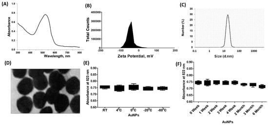 Synthesis and characterization of gold nanoparticles (GNP). (A) Ultraviolet-Visible (UV-Vis) spectra of GNP. (B) Zeta-potentialand (C) particle size distribution of GNP determined by dynamic light scattering. (D) Transmission electron microscopy (TEM) image of GNP. (E) Determination of stability of GNP against varying temperatures. (F) Determination of stability of GNP against storage time.