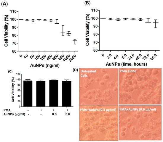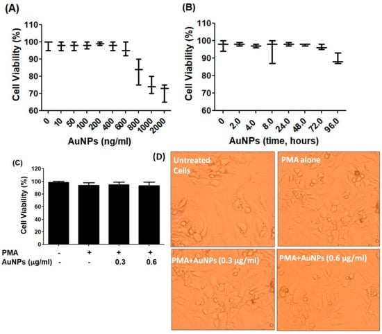 GNP on the viability of MCF-7. (A) Percent viability of MCF-7 cells (3 × 106 cells/mL) against GNP (0–2000 ng/mL) treatment for 48 h. (B) Percent viability of MCF-7 cells (3 × 106 cells/mL) against GNP (600 ng/mL) for 0–96 h treatment time. (C) Percent viability of PMA-activated MCF-7 cells (3 × 106 cells/mL) treated or untreated with GNP for 24 h. (D) Phenotypic evaluation PMA-activated MCF-7 cells treated or untreated with GNP for 24 h. The data shown are mean ± SD of five independent experiments.