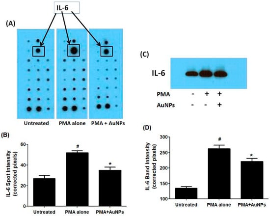 IL-6 secretion by PMA-activated human BC cell line MCF-7 cells treated or untreated with GNP. (A)The levels of IL-6 in the pooled culture supernatant (n = 3) of PMA-activated MCF-7 cells treated or untreated with GNP (0.6 µg/mL) for 24 h were quantified by human cytokine antibody array. (B) IL-6 spot image was digitally captured by the Un-Scan-It software and the band intensities were expressed in corrected pixels with background correction. (C) The levels of IL-6 in the pooled culture supernatant (n = 3) of PMA-activated MCF-7 cells treated or untreated with GNP (0.6 µg/mL) for 24 h were quantified by Western immunoblotting. (D) IL-6 band image intensity was digitally captured by the Un-Scan-It software and the band intensities were expressed in corrected pixels with background correction. # p < 0.05 versus untreated; # p < 0.05 versus *.