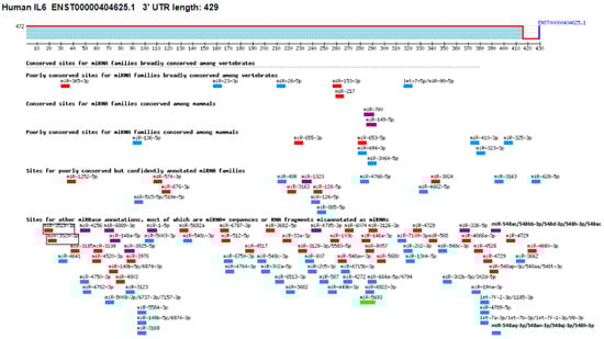 Target scanning of seed matched sequence of miRNAs in the 3′UTR of human IL-6. Human IL-6 mRNA 3′UTR (ENST00000404625.1) predicts conserved site for <100 miRNAs. The figure was generated using an online bioinformatic software Targetscan using the link https://www.targetscan.org/cgi-bin/vert_72/view_gene.cgi?rs=ENST00000404625.1&taxid=9606&members=&subset=1&showcnc=1&shownc=1&shownc_nc=1&showncf1=1&showncf2=1#miR-365-3p (accessed on 22 October 2023).