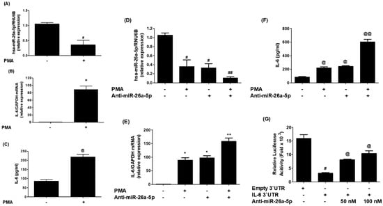 MicroRNA miR-26a-5p negatively correlated with IL-6. (A)Expression of miR-26a-5p in PMA-activated BC cells. (B) PMA-activated IL-6 mRNA in cancer cells. (C) PMA-activated IL-6 secretion in the cell culture supernatant. (D) PMA-activated miR-26a-5p in anti-miR-26a-5p transfected cancer cells. (E) PMA-activated IL-6 mRNA in anti-miR-26a-5p transfected cells. (F) PMA-activated IL-6 in the culture supernatant of anti-miR-26a-5p transfected cells. (G) Luciferase activity in cancer cells transfected with the reporter vector containing entire 3′UTR of IL-6 mRNA (IL-6 3′UTR) and anti-miR-26a-5p. Bars with different symbols are statistically significant, p < 0.05.