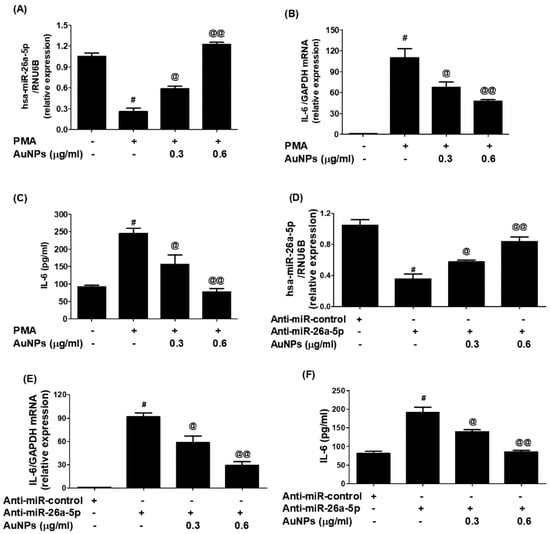 Modulation of expression of miR-26a-5p and IL-6 by GNP. (A) GNP increase miR-26a-5p in PMA-treated cancer cells. (B) GNP suppressed expression of IL-6 mRNA in PMA-activated cancer cells. (C) GNP suppressed IL-6 in the culture supernatant of PMA-activated cancer cells. (D) GNP increased miR-26a-5p in cancer cells transected with anti-miR-26a-5p. (E) GNP suppressed IL-6 mRNA in cancer cells transected with anti-miR-26a-5p. (F) GNP suppressed IL-6 secretion by the cancer cells transected with anti-miR-26a-5p. Bars with different symbols are statistically significant, p < 0.05.